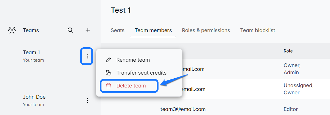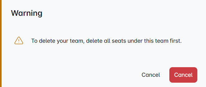 Before deleting a team, make sure to remove all seats (team members) assigned to it. This is a must-do step before the delete option becomes available! ✅