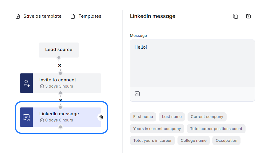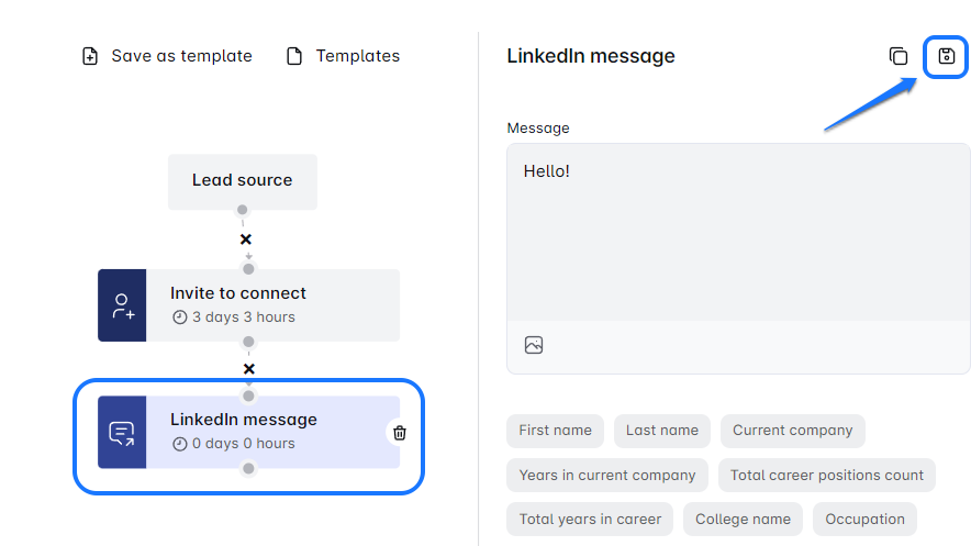 Save time with the SALT Marketing Linkedin Automation’s step copy-and-paste feature! Easily duplicate steps like Invites, Messages, or Emails, and customize them in sequence. Save key steps as templates in the Template Library for future campaigns. Streamline your workflow and boost efficiency! 🚀 Need help? We’re here for you.