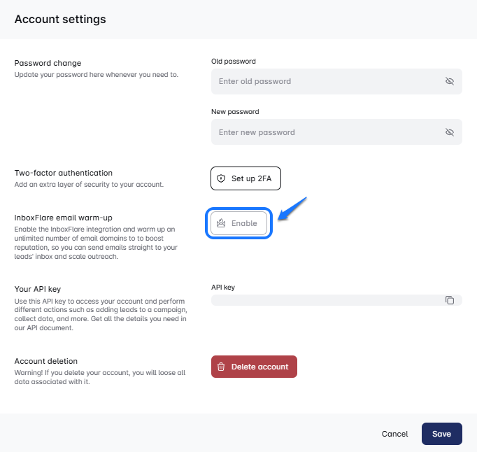 1. To start, you need to enable your InboxFlare account in SALT Marketing Linkedin Automation. Go to your Account settings in SALT Marketing Linkedin Automation and find the InboxFlare email warm-up. Click “Enable”.